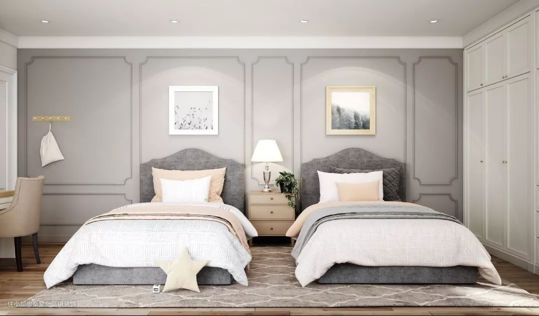 二胎房设计可以在上面的男孩房、女孩房延展出来。上下床更适合小户型使用,节省空间又能保证舒适的居住空间;独立双人床,需要更大面积,适合中大户型。