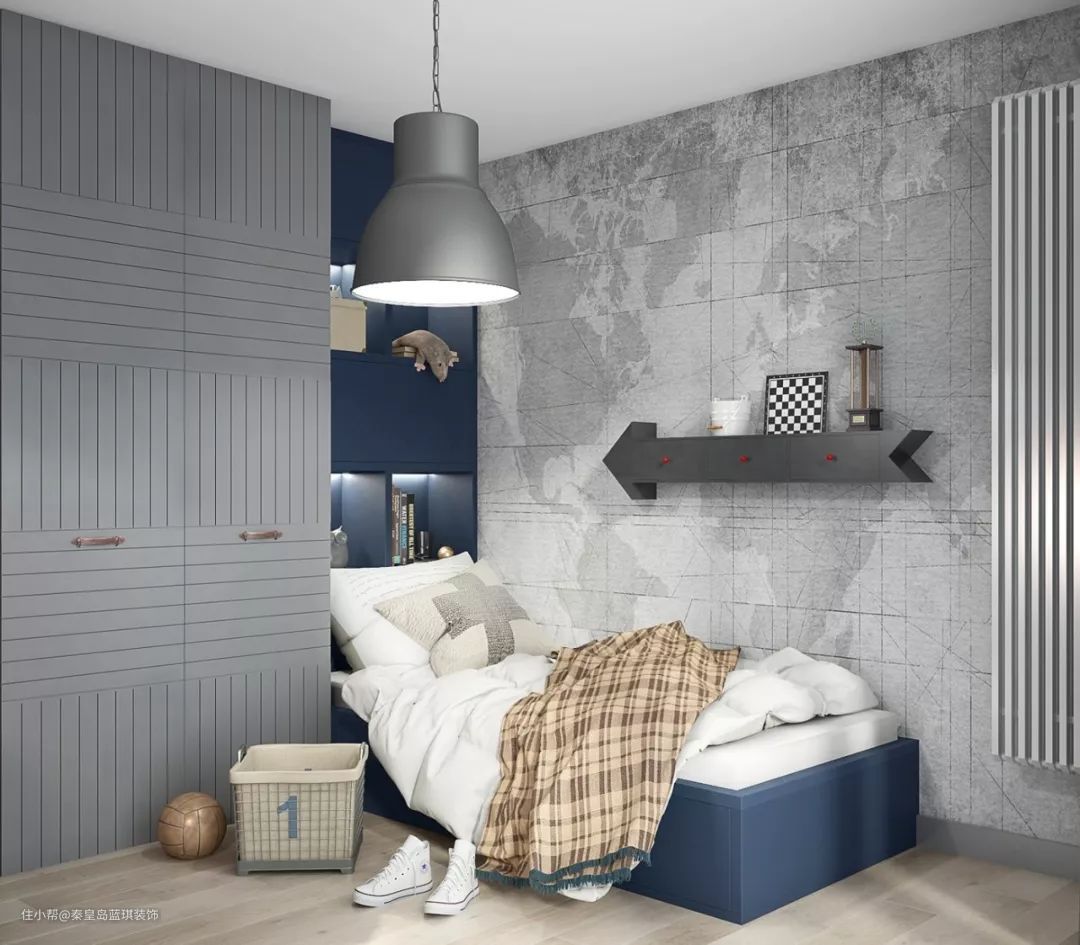 男孩子房间在配色上会采用蓝色、灰色、黄色较多,天真活泼的同时带些沉稳的气息,符合男孩子的气质。
