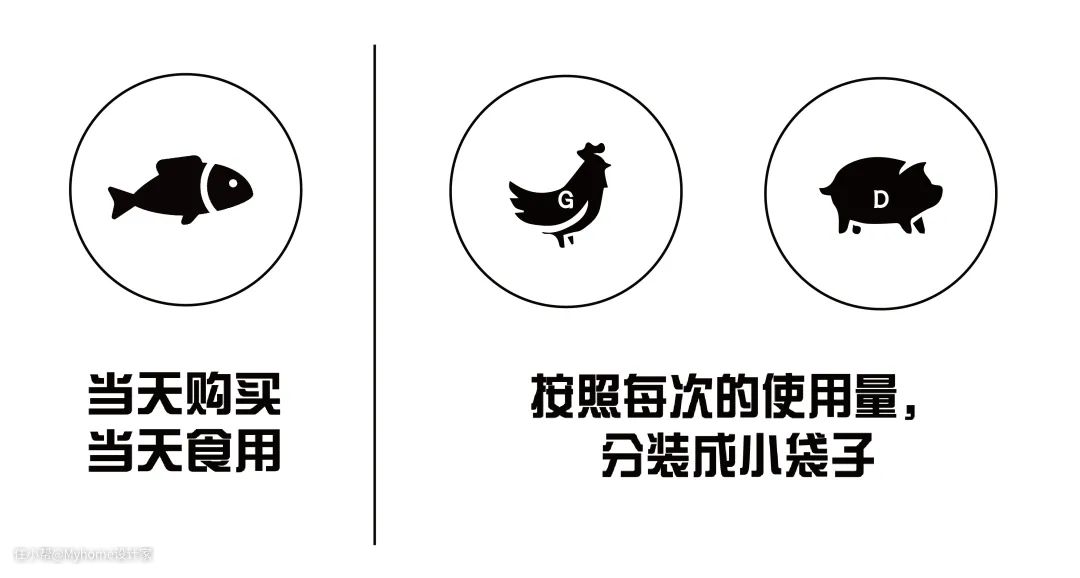 原则上,阿庭其实比较常买新鲜的食材,当天用不完的才分装小袋收藏至冷冻库,尽量三天内用完。鱼类尽量当天购买当天食用完毕,肉类则是按照每次的使用量,分装成小袋子,G肉是鸡肉、D肉是猪肉的代号。