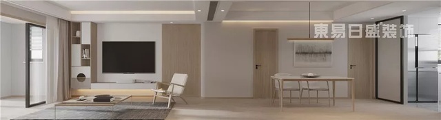 客厅餐厅厨房没有明显的分隔,几乎是融为一体的。厨房装有推拉门,打开是一气呵成的大空间,关上则可以很好的避免油烟进入公共区域。