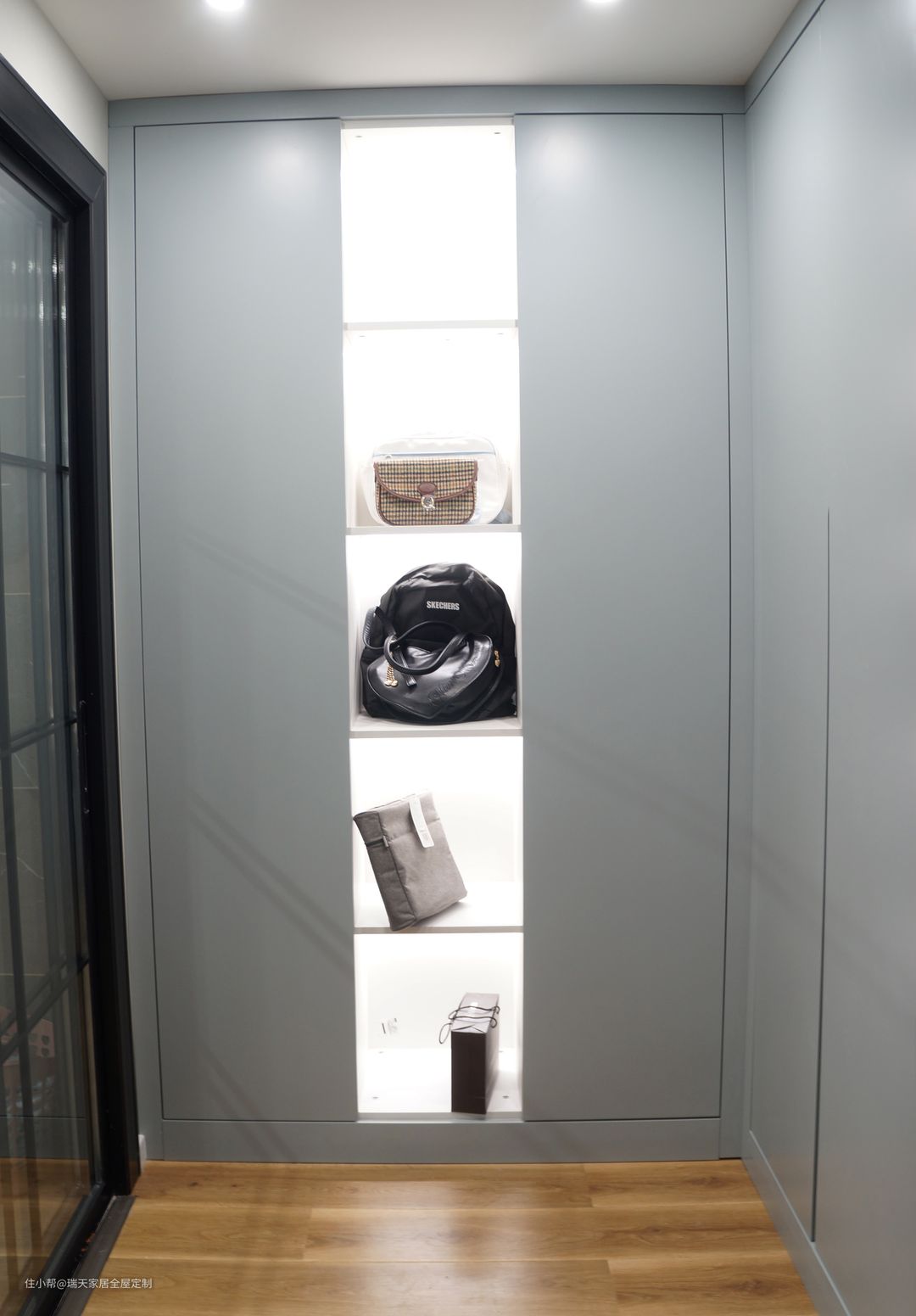 ▲中间一部分设计为开畅空间,既便于小东西的随取随放,又能缓解柜门整片深色带来的沉闷感。