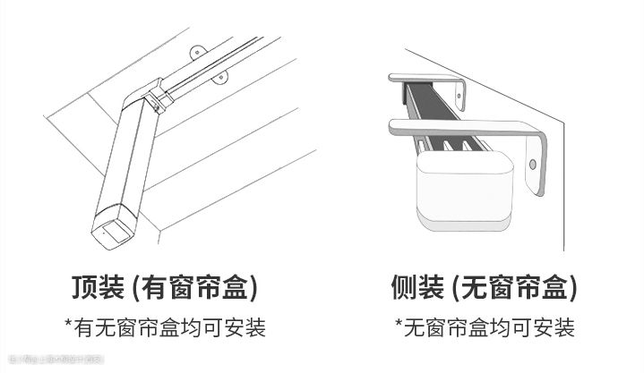 ③安装方式:轨道的安装方式有两种:一种是顶装,一种是侧装,安装在侧面墙体上,适用于无窗帘盒空间。