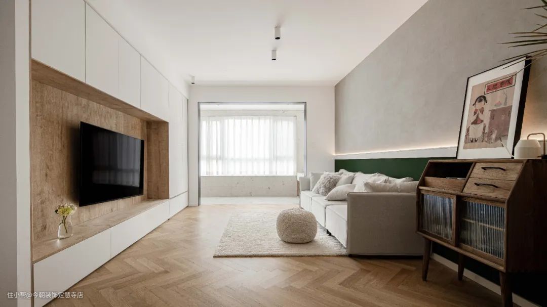 客厅没有挑选瓷砖的地板,而是选用木地板,这样会更加的耐脏。墨绿色和水泥灰混搭的背景墙略显复古,整个空间在绿色的点缀下活跃了起来。家具以布艺、木制家具为主,富有质感同时也给空间增添一份亲和力 。