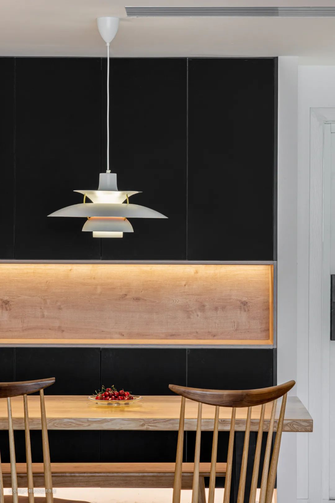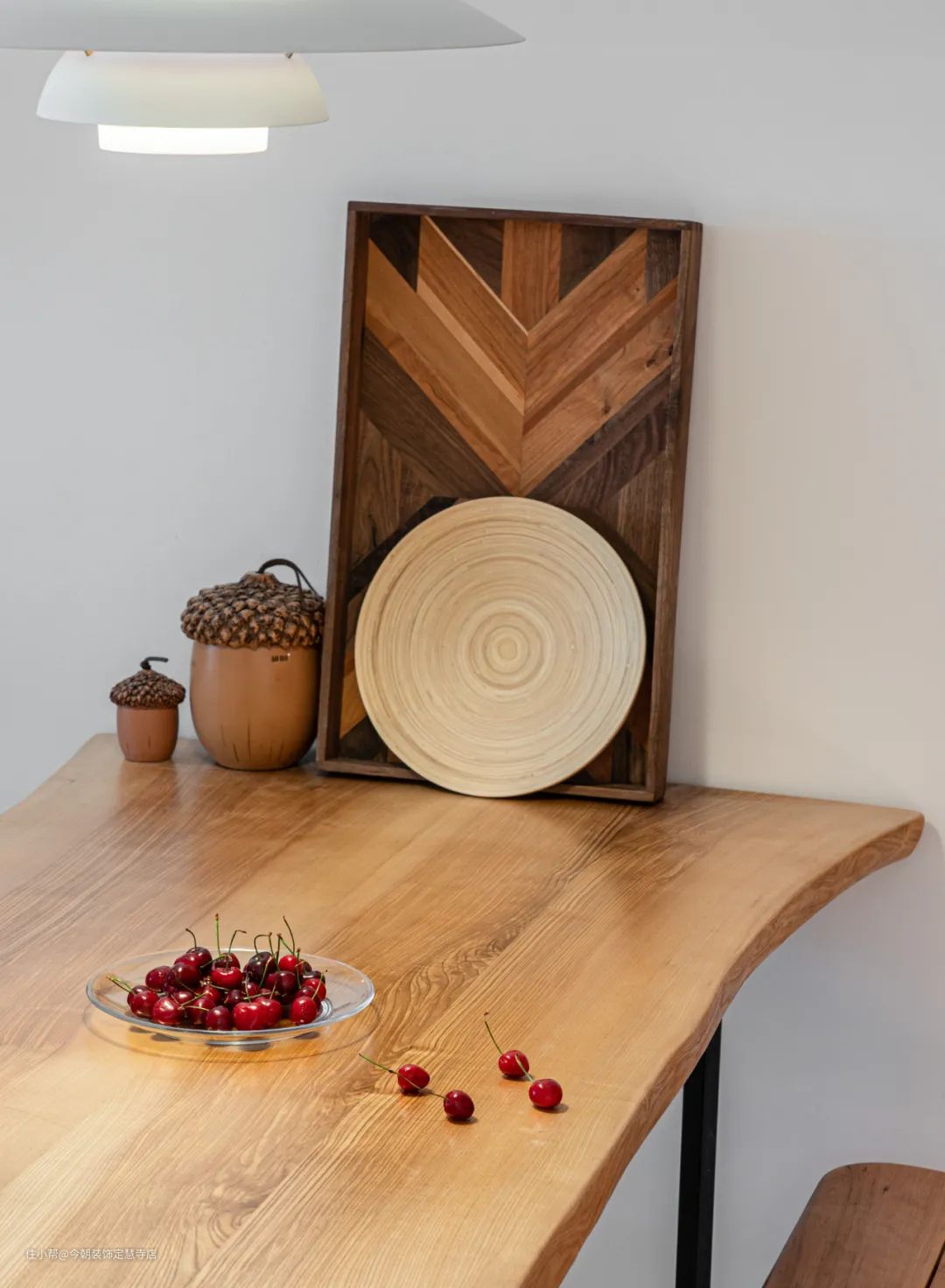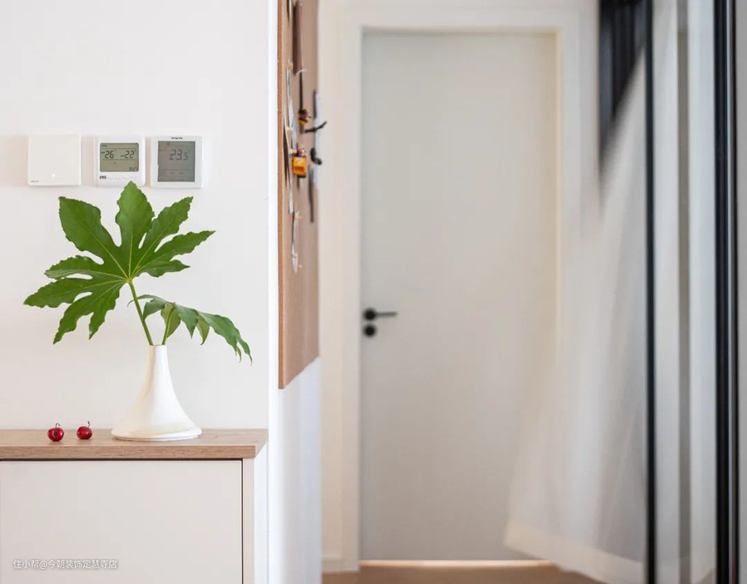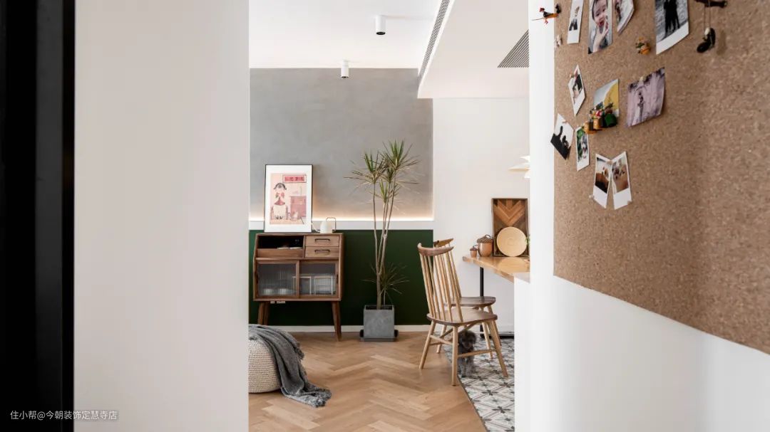 餐厨区域使用白色和木色的搭配,视觉上显得舒适通透。走廊空白的墙面装上软木板可以让业主来记录生活的点滴。