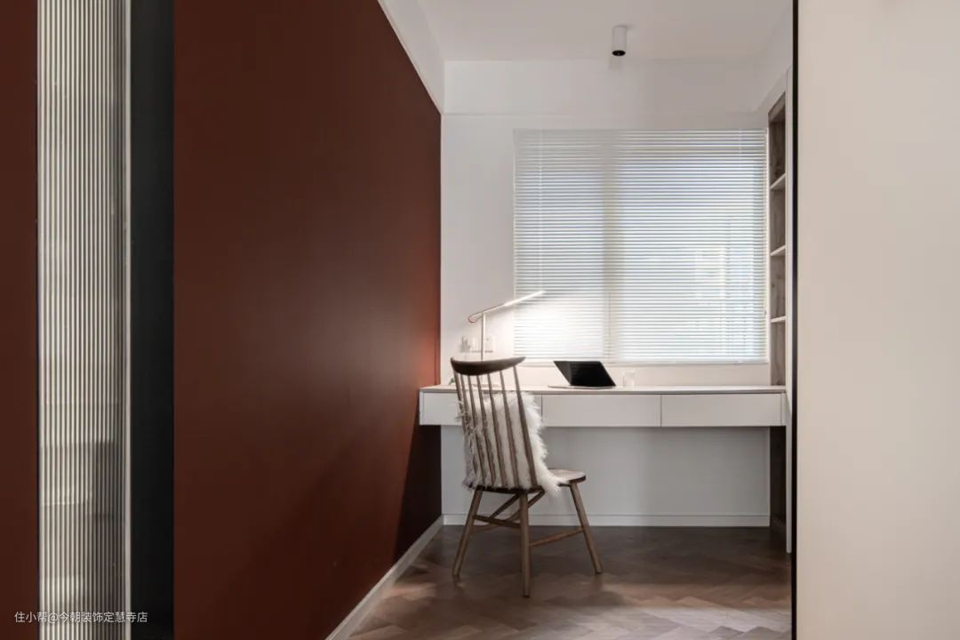 主卧的套房设计,可以给业主更强的居住独立性以及舒适感。整体延续了客厅的风格,白色和木色互相呼应,绿色作为空间的点缀色。照明以射灯和灯带为主,加上床头的落地灯做局部照明,整个空间显得很有层次。