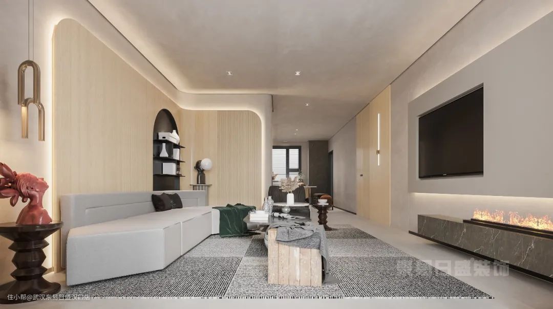 全屋无主灯设计,着重烘托极简质感的空间氛围,别具一格的沙发造型,天然外形的木质单椅,搭配墙边壁炉火焰,是内敛的心绪,也是无视世俗的美学追求。