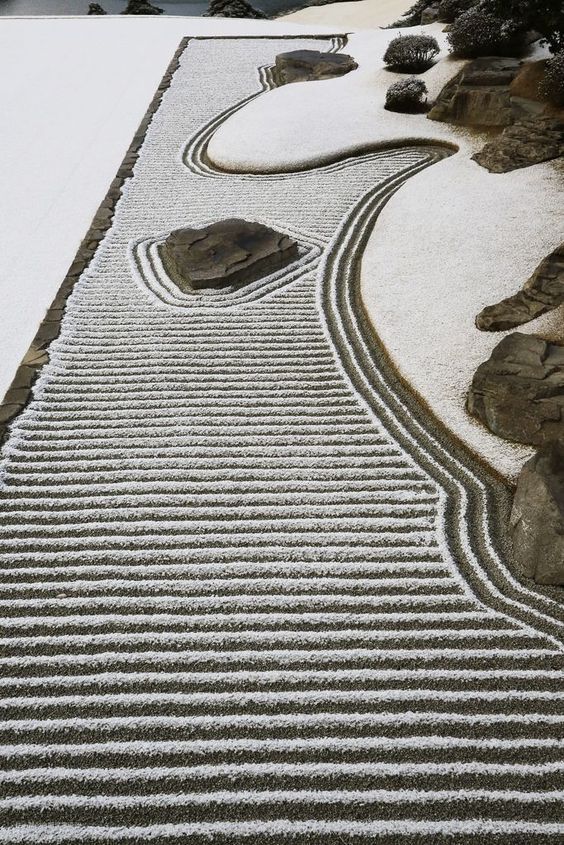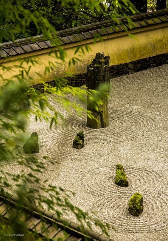 日式小庭院大致分为2类,第一类就是这,枯山水庭院,常见于书斋、寺院当中,在布置上以岩石为主,白砂、竹/松为衬,没有水,但看上去就像是把一幅山水画搬到了地面上一样,极富禅意▼