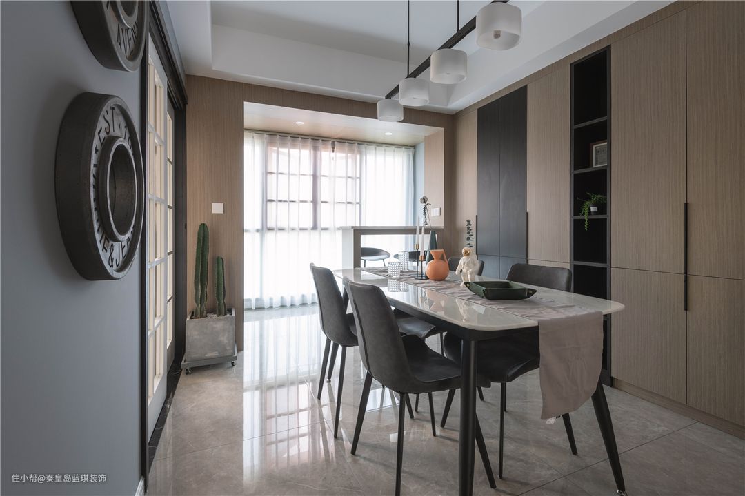 四周吊顶中间挂上特别的吊灯,落落大方的设计。餐厅还打了整面的收纳柜,收纳空间很足够。