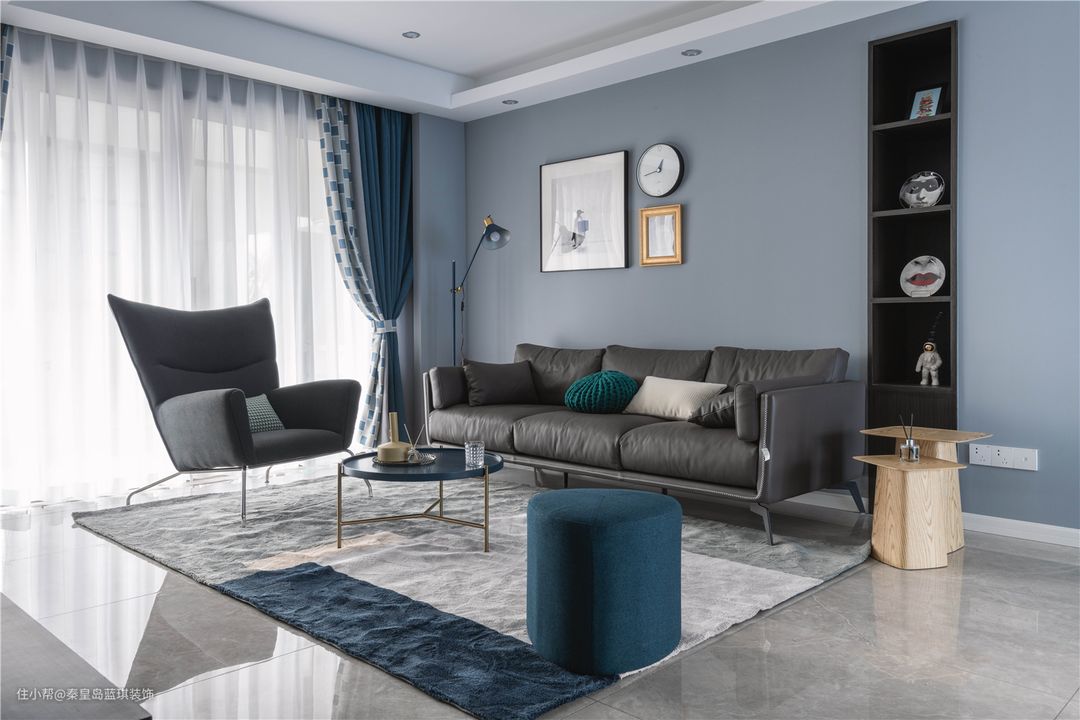 舒适的沙发、小巧精致的茶几,非常典雅高级的色调搭配,深海蓝加上高级灰,非常耐看。