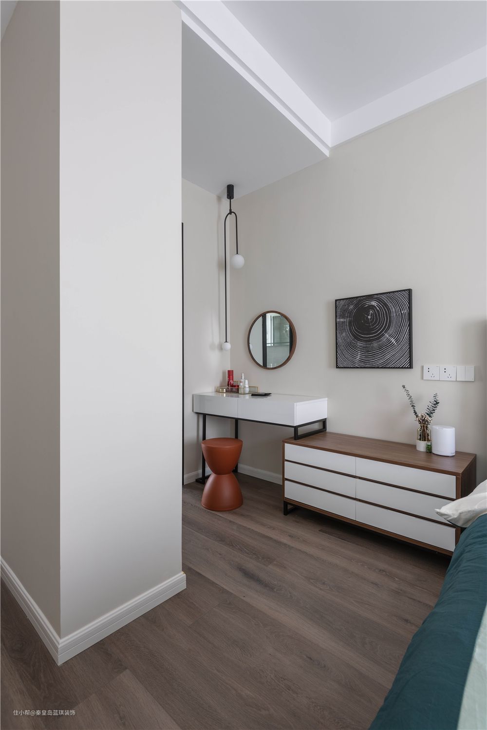 设计师还很机智的将不可改造的承重柱,做成空间的划分,做出一个化妆区的空间。