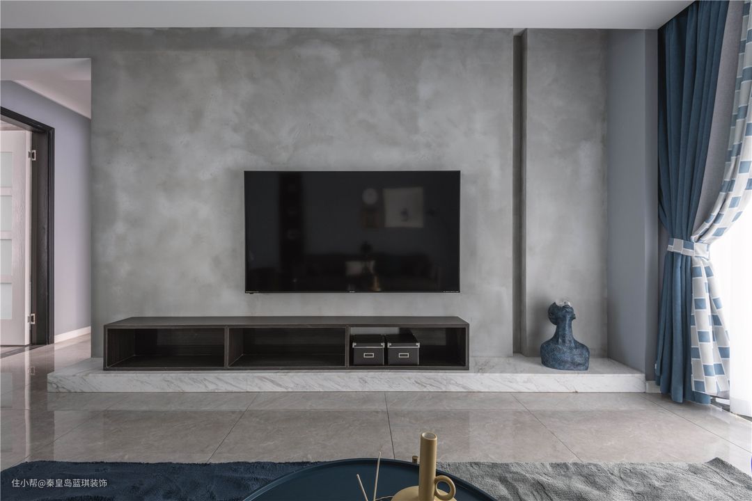 电视墙用的是水泥电视墙,但是并没有粗糙的感觉,这样的灰色和蓝色、黑色的搭配反而显得简洁干净有高级感。
