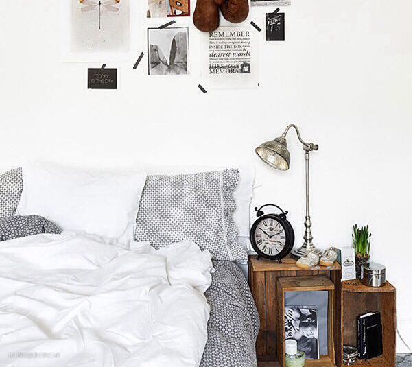 木条箱绝对是收纳好物,如果你跟水果店老板是好朋友,指不定也能免费得到一个。除了收纳,你还能把它当做床头柜,横着、竖着、立着都可以,你也可以把上图中的书放到木条箱里,方便移动。