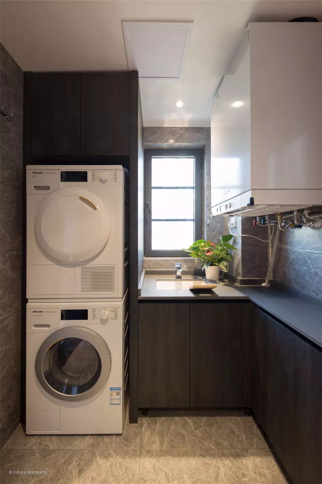 这边是洗衣机、干衣机,带洗手池的地柜,暖气炉......对面就是到顶的收纳柜了,竖向设计,可以轻轻松松将带柄的清洁工具收纳其中,这一点,大家一定要注意,之前采编过的一位业主就后悔,收纳柜没有设计这种可以收纳戴森、拖把、扫把等带柄的高度。