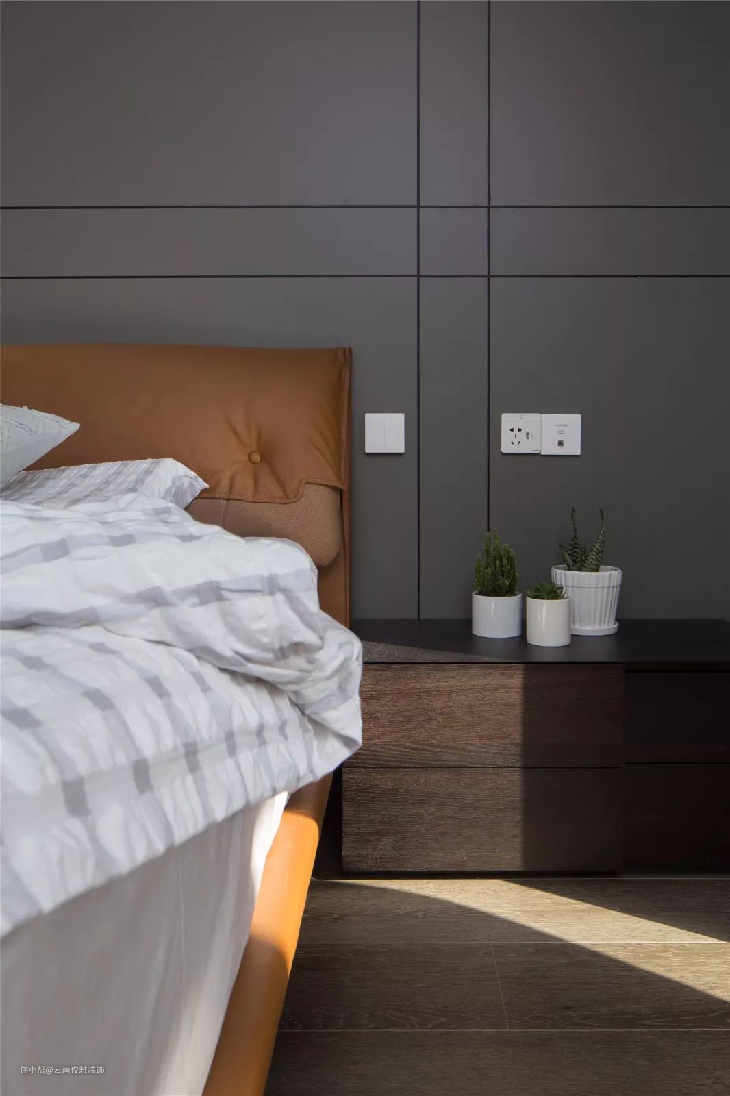 重点说下,主卧背景墙的设计,裁切纹路是不是还挺熟悉的?!!没错,借用了burbeery的经典设计,现场让工人裁切成特定尺寸,并用金属条镶嵌装饰,逼格立马上来了。
