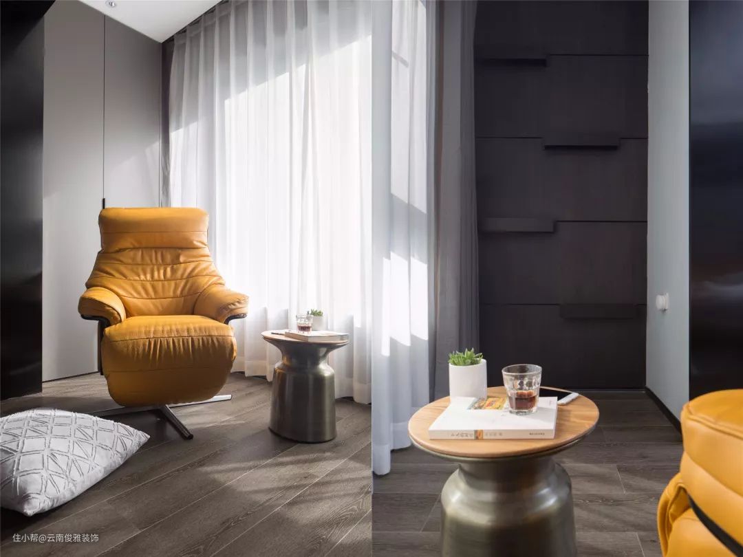 碳黑木进口颗粒板当背景墙,延续了整体简约黑白灰主基调,沙发单椅茶几包括阳台茶桌等家具都是一家买的,背景墙上的不规则形油画是真人手绘,加入了一抹柠檬黄,给整个沉稳的色调里注入了一丝活力。