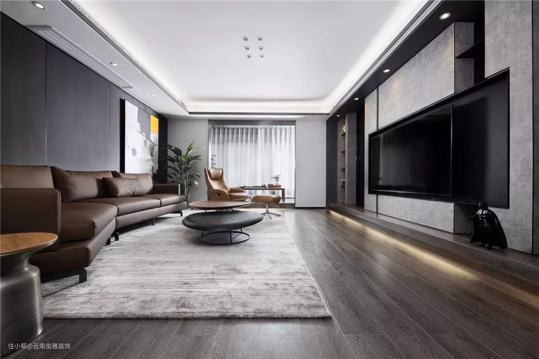 背景墙这里必须要好好说说。不是传统的一堵墙,而是用定制板材做了半隔断设计,用地台将背景墙后的休闲区整个都抬高,隐形踢脚线加线型灯带让地台显得轻盈起来。