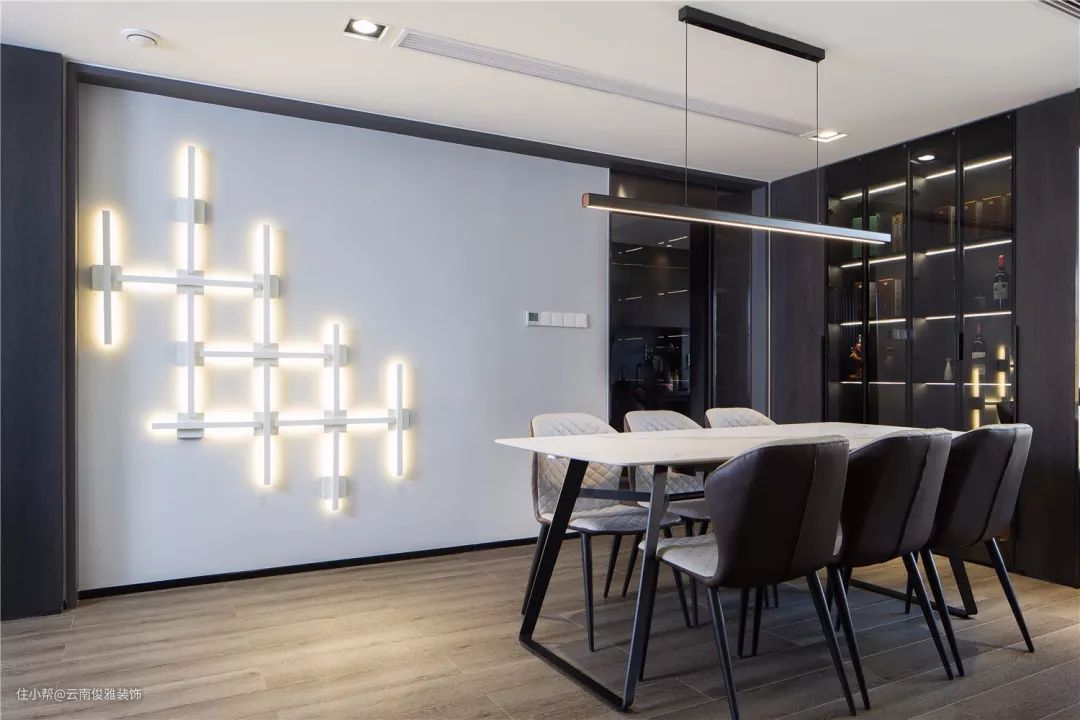 餐厅借用了洗衣房一部分的面积,做成了黑玻收纳柜。黑玻比常见的透明玻璃跟主色调更加统一,而且也不会显得特别凌乱。反面就是洗衣房的收纳柜,减少了实体墙的出现,将功能和实用性最大化。