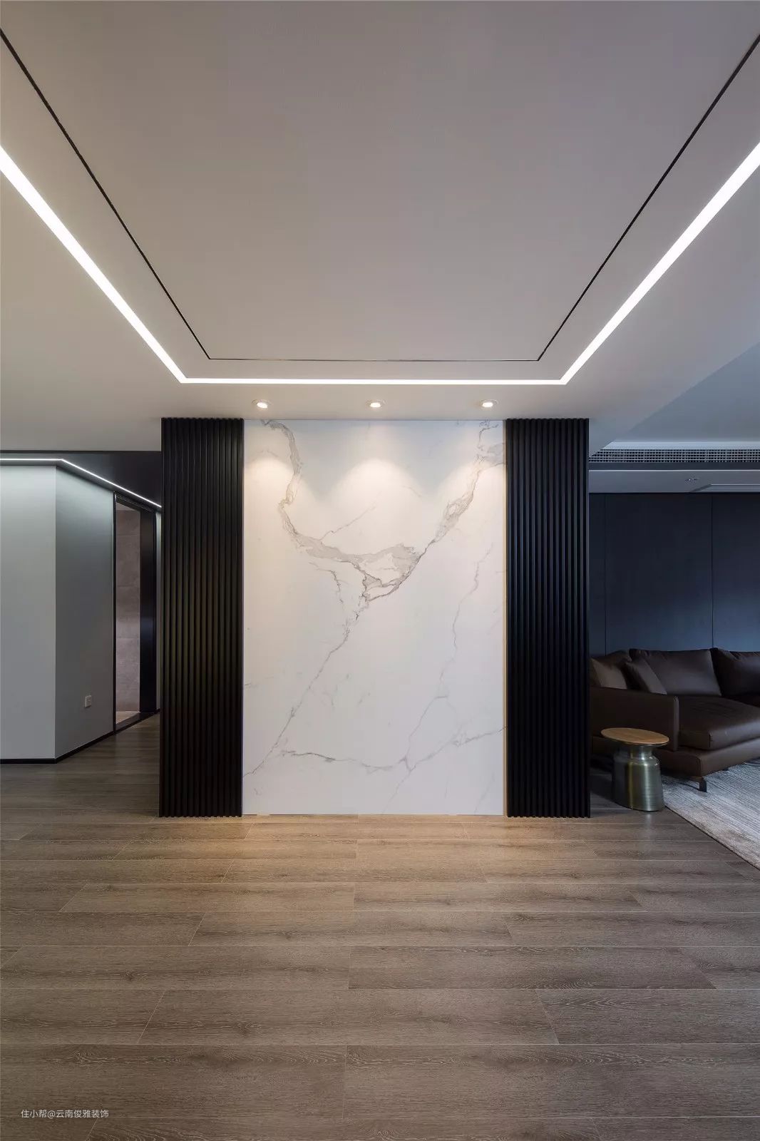 一进门就是黑色定制栅格+岩板背景墙,对称设计,千万别以为背景墙就是荷叶配荷花,不同材质的融合,高级又有美感。