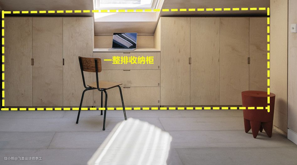 斜顶空间,高度有限,所以做其他功能区,身高超过1米5以上就得弯着腰使用,因而设计师给建议做了一整排斜顶收纳柜,遮盖了阁楼斜顶的缺陷,让整个空间视觉上更方正了一些,一整排柜子收纳充足。