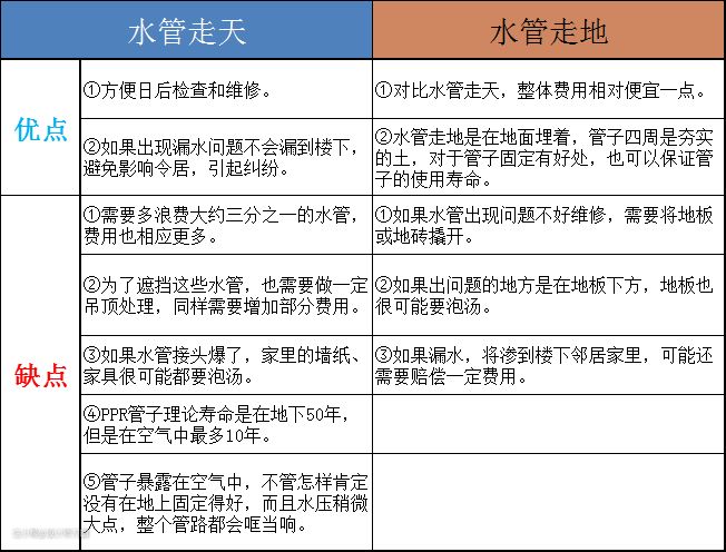 1.水管有两种布管方式,水管走天和水管走地,它们的优缺点:
