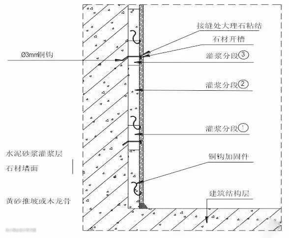 8.石材灌浆施工工艺:石材排板放线→预排石材→板材固定→灌桨→嵌缝