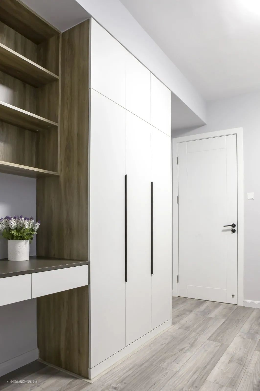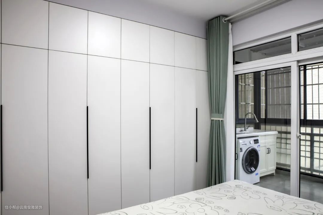 5、靠墙位置还设计了一整面墙的收纳柜,白色柜门,简约黑色拉手,全部拉开看,场面相当震撼,今后入住了,就算有再多杂物都不怕。