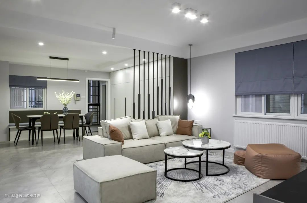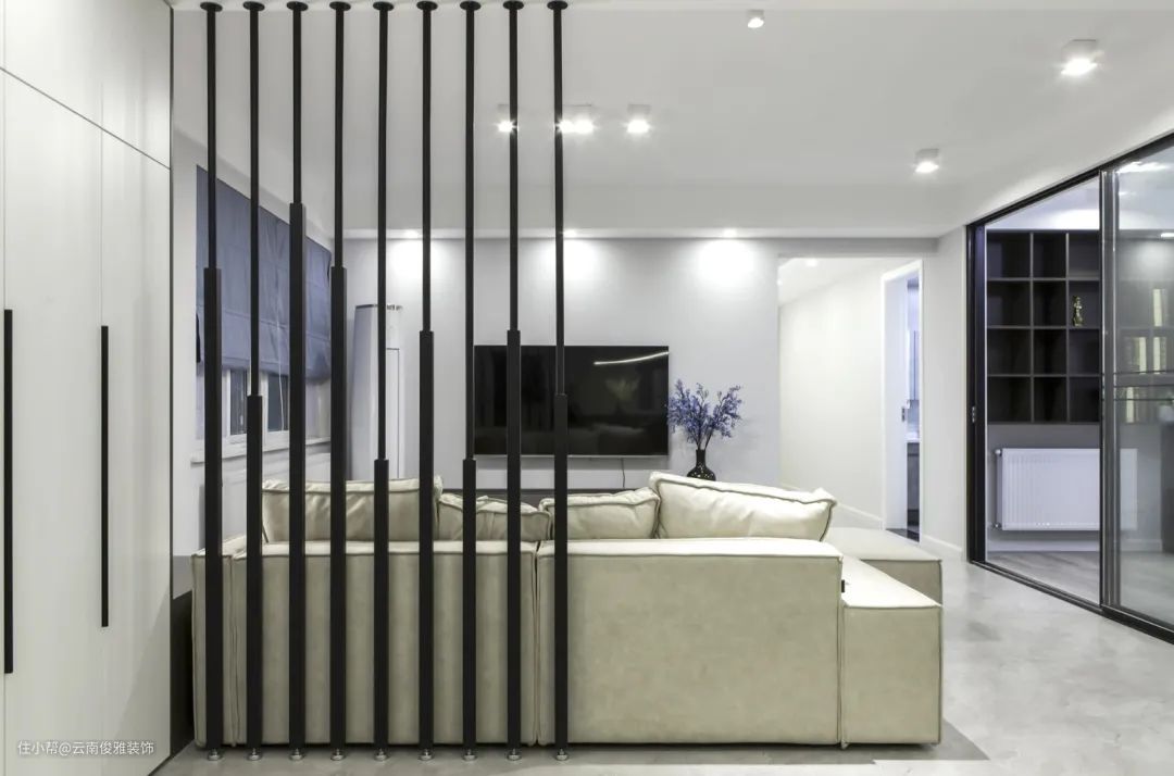 6、客餐厅空间非常大,为了有个划清区域,特地选择了黑色金属隔断,“隔而不断”还增加了一丝时尚感。错落有致的线条感,简洁耐看。