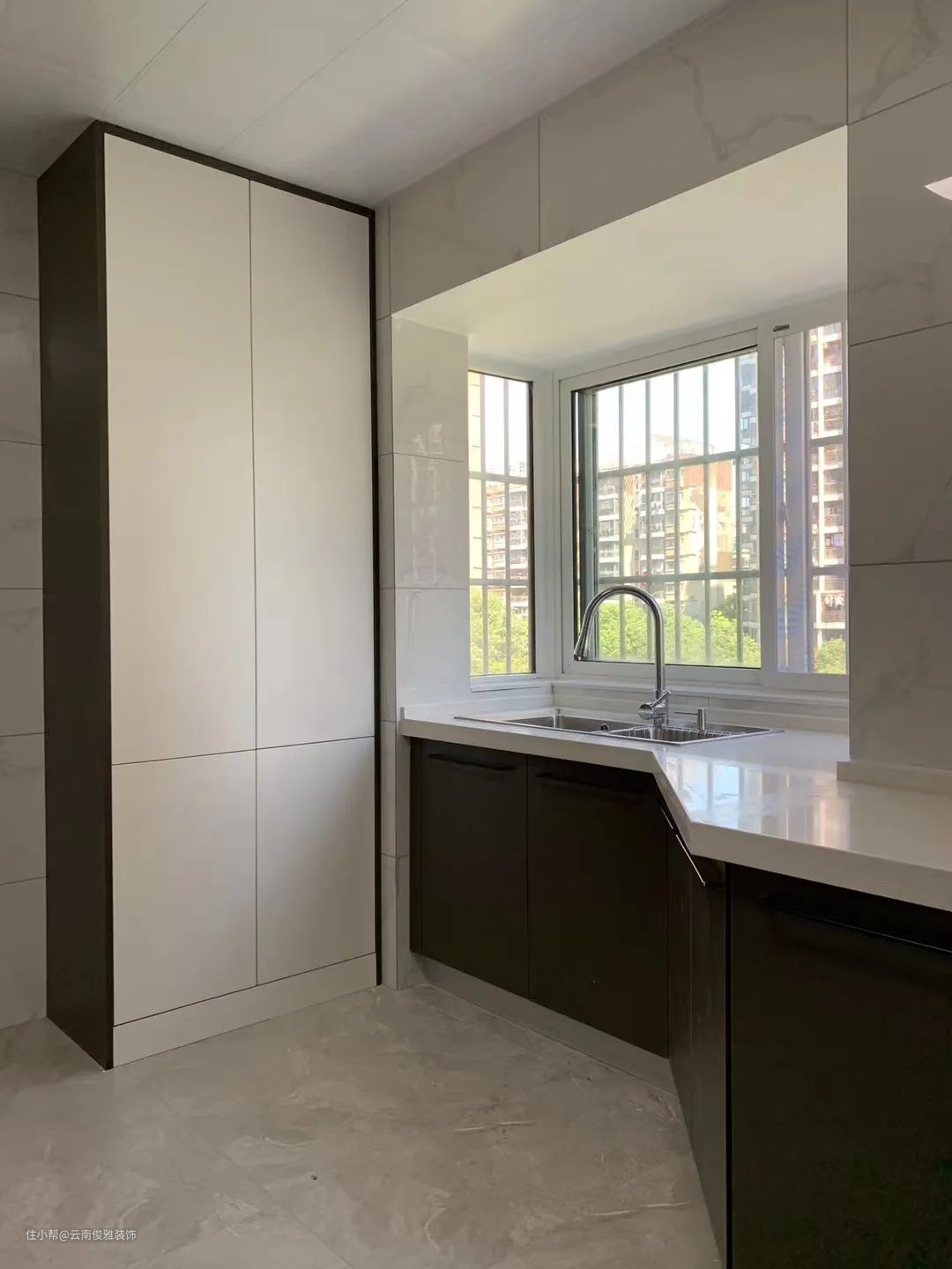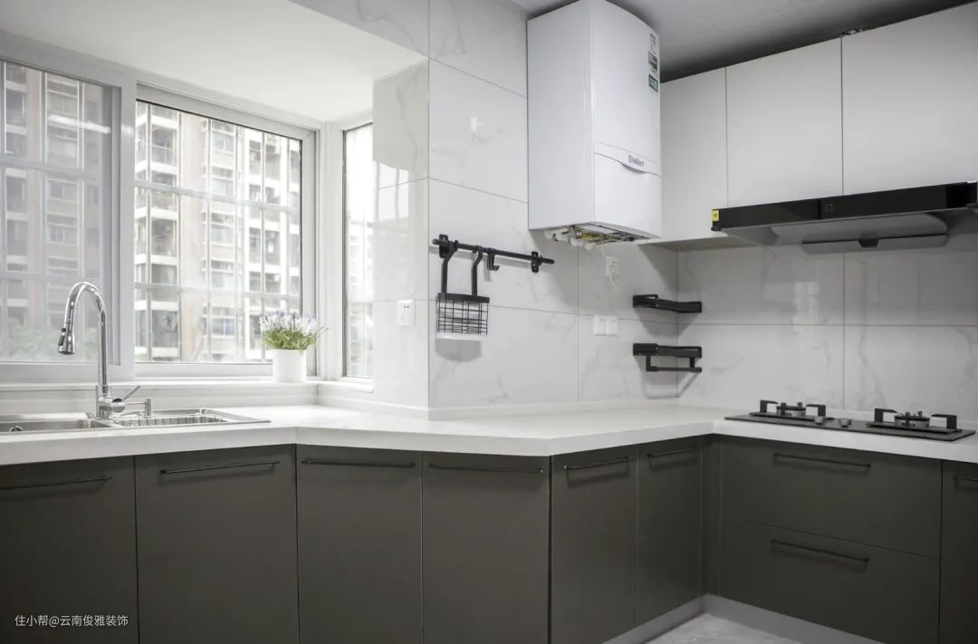 14、利用原始飘窗,设计出了异形橱柜,杜绝空间浪费,同时还延长了操作台面,视野上也很舒爽。