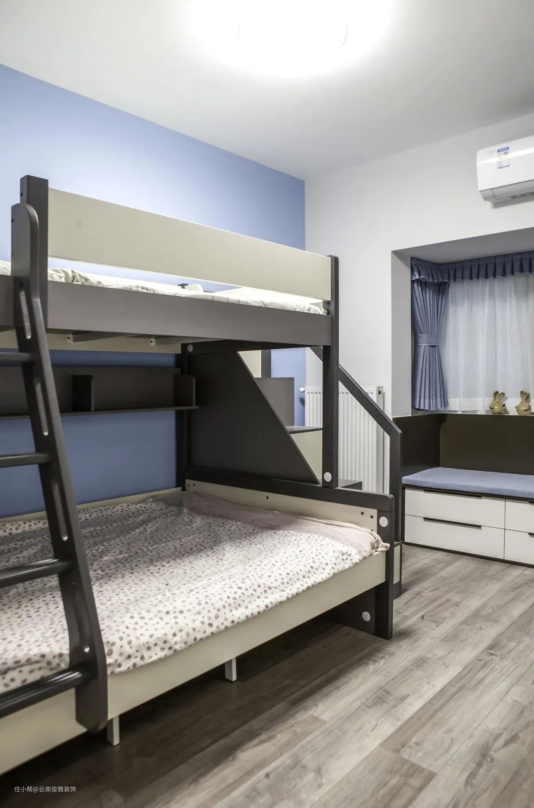 21、儿童房面积不大,虽然家里只有一个小孩,但还是选择了双层床,方便屋主的外甥过来留宿。雾霾蓝乳胶漆,也比较符合小男生的喜好。