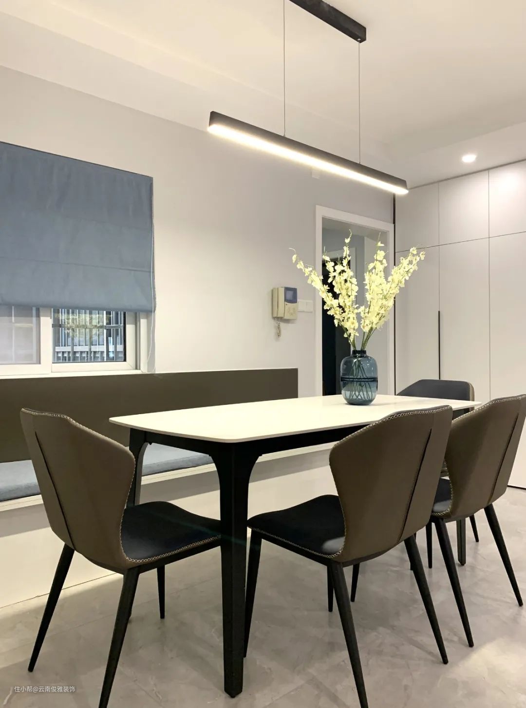 4、餐厅选择了卡座设计,节省空间,还增加了收纳功能。整体简约黑白灰色调,特别要跟大家说下,这个地砖选的特别有质感,花色也耐看,还不显脏。