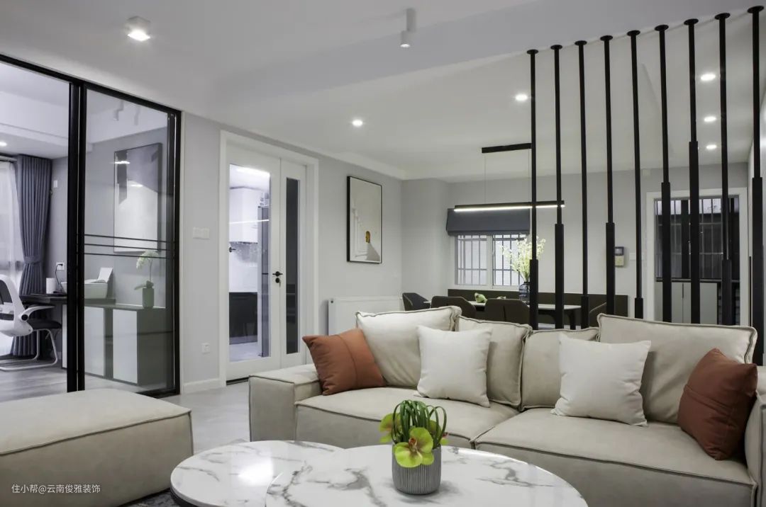 3、客餐厅全开放式、书房半开放式,整个空间立马显得开阔通透。书房选择双开梭门,这里是我超喜欢的位置,采光视野都超级赞!