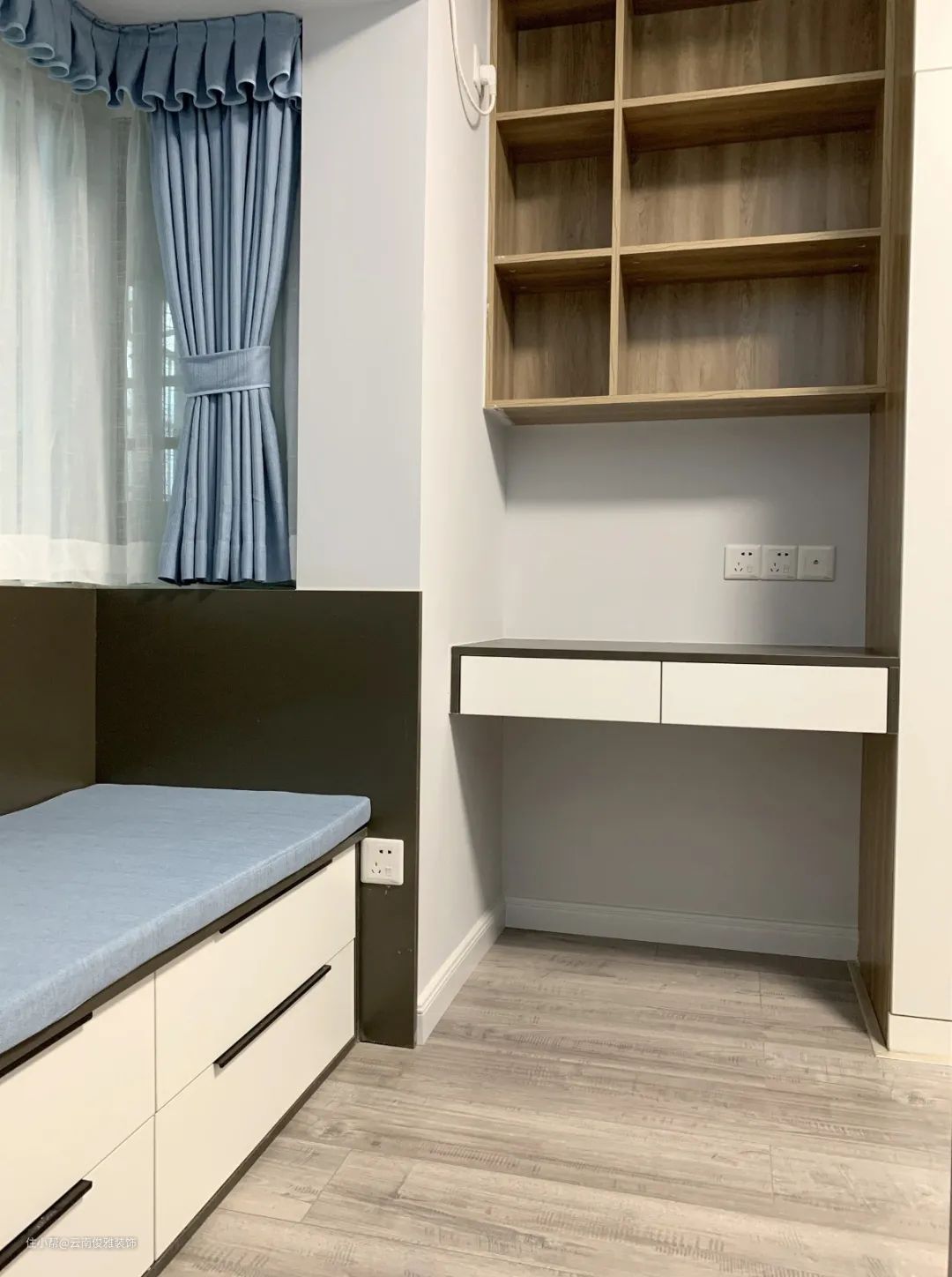 20、书柜也是定制的,不过没有设计成整面收纳柜+书柜,而是选择了异形书桌,这样不会显得整体比较压抑。