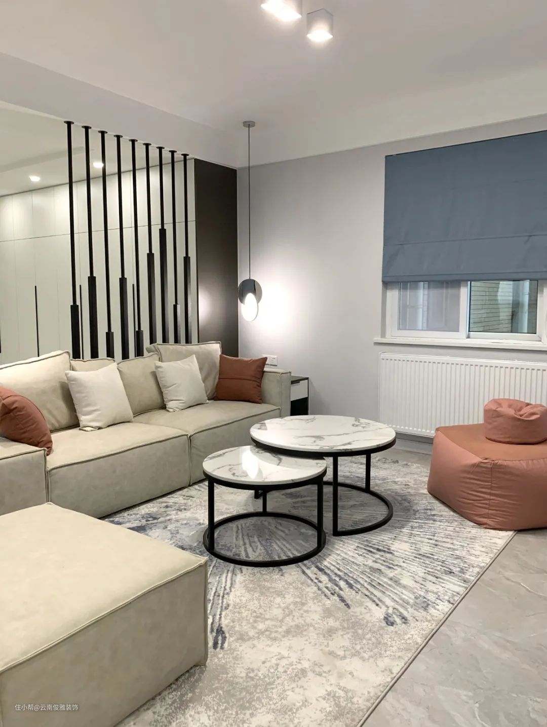 10、为了不让整个空间显得过于单调,特地选择了橙蓝撞色,卷帘的颜色也跟地毯的深蓝相呼应。