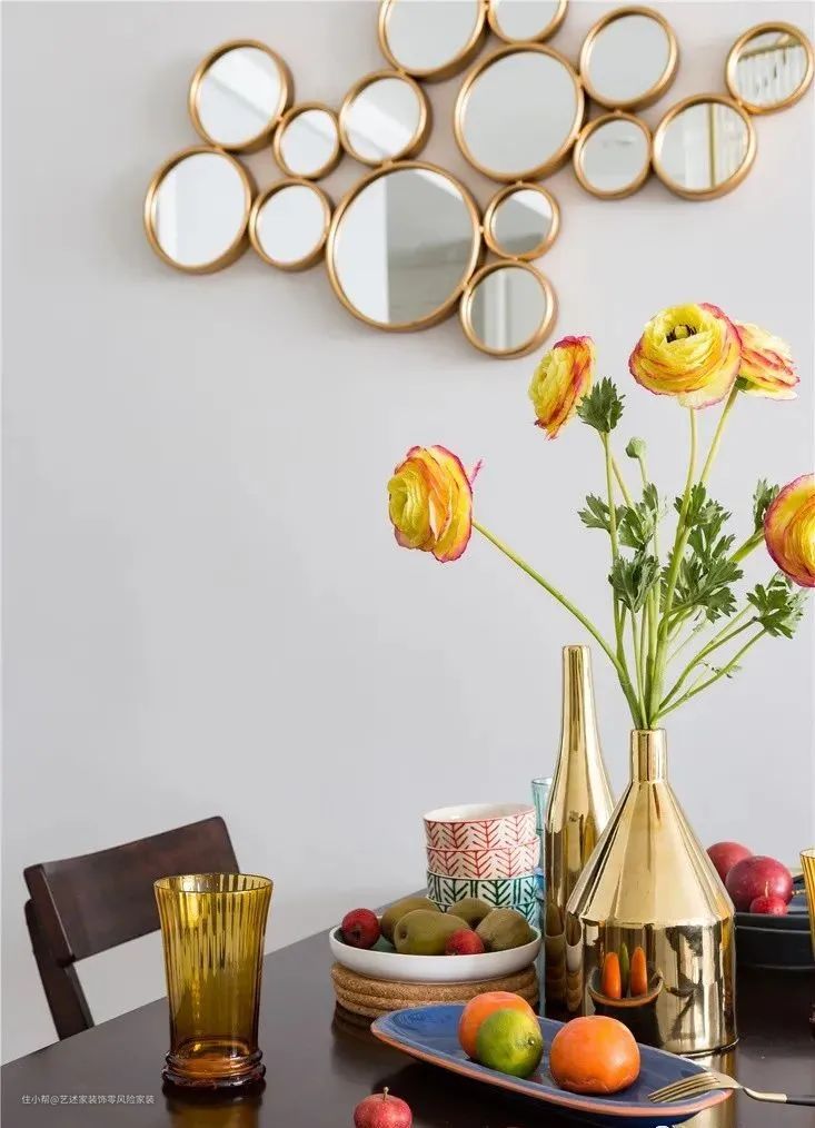 ▲餐厅,选用客厅同色系的家具,保证风格的连续性。一侧墙面采用镜面组合设计,提升空间质感的同时,也带来了很好的视觉效果。