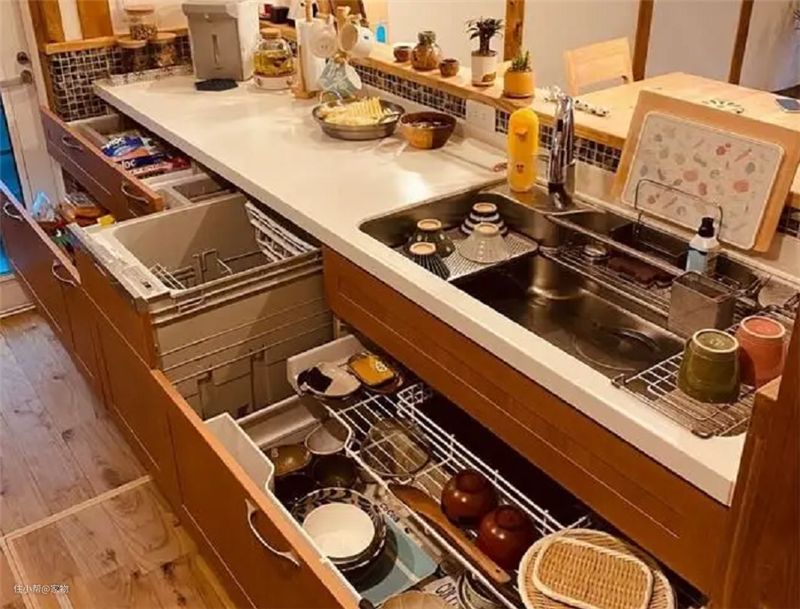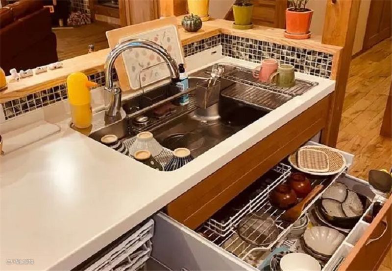 这样一来,洗完的碗筷餐具可以顺手收纳下面抽屉里,