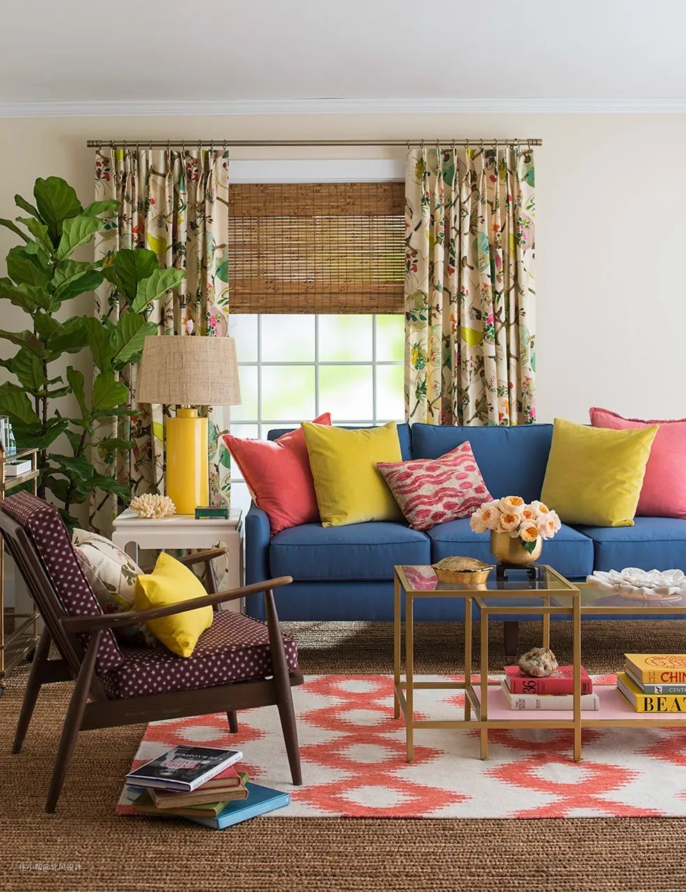 用更新的蓝色、红色和黄色调在原色的调色板上进行调整。例如,一个引人注目的蓝色沙发,与抱枕、小地毯、亮黄色和鲑鱼色的配饰形成对比,看起来更加活泼。使用中性墙壁颜色和强调家具,使其他更富有戏剧性的色调更加柔和。