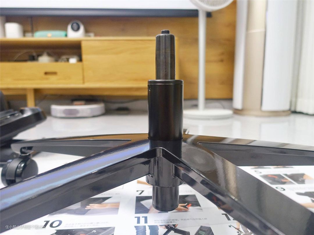 最后将座椅重新翻转过来,多角度倾斜底盘上的固定孔对准气压棒内芯插入,至此,整把椅子的安装便完成了,整个安装过程只涉及到八颗内六角螺丝的安装和一颗红色锁定螺丝的拆卸,安装过程非常简单,就算是女生也能轻松完成。