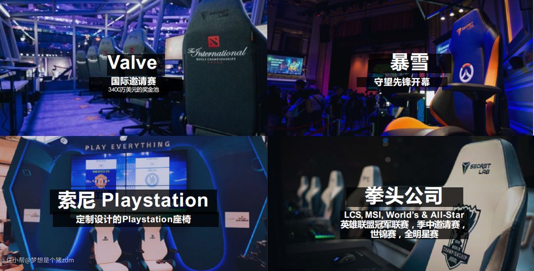 Secretlab电竞椅和拳头,暴雪,索尼,Facebook等公司都有合作开展游戏活动,成为世界多家顶级职业电竞团队的首席正式合作伙伴,并且和与拳头公司,华纳兄弟,deadmau5和HBO等知名品 牌合作开发联名座椅并发售,在电竞圈的影响力可谓举足轻重。