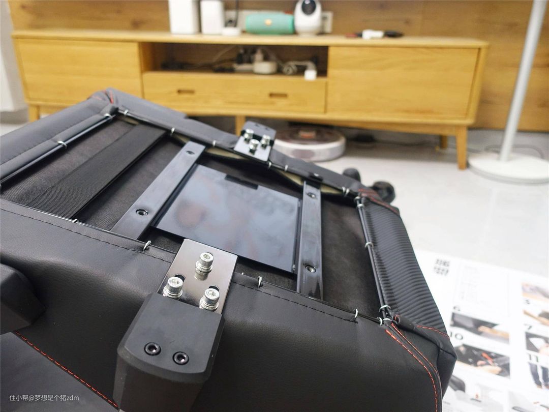 将座椅翻转,下方朝上,可以看到座椅底部的工艺,中间是加厚的防爆钢板,四周的钢架也非常厚实,位于两侧的六颗内六角螺丝是用来调节扶手间距的,如果觉得扶手之间距离不够宽,就可以松开这六颗螺丝,将扶手往两侧拉动到合适范围后,再将螺丝固定就可以了。