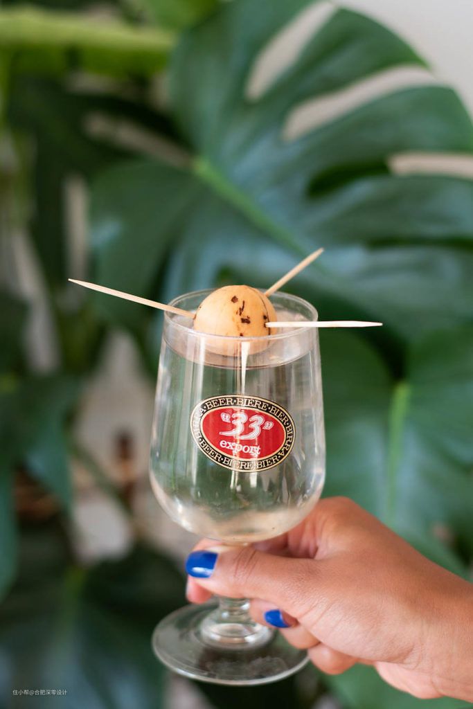 牛油果催芽阶段和菠萝蜜果核有异曲同工之处,先撕掉表面咖啡色的膜,因为这一层不撕,经过水培之后,可能会发霉。它的水培方式有2种,一种是大家知道的,牙签插入在果核身上,把尖的那头朝上,胖的那头朝下,浸泡把水里;