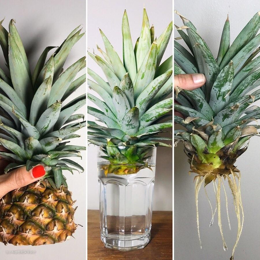 买回整个菠萝,切掉顶花,去掉破落头底部的果肉,摘掉剥落头底部的4-5层的叶子(这样才能顺利生根),把菠萝头放入水中浸泡,水位高度在剥掉的叶片处,养护时每天进行换水一次,避免烈日暴晒,等菠萝长出根须后再移栽到土里正常养护,只要保证菠萝头健康,很容易就能繁殖成功结出菠萝来▼