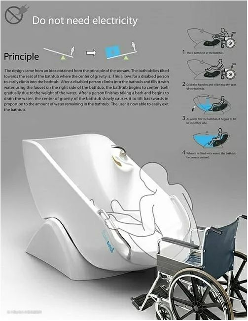 4、残疾人专用浴缸:这是一款专门为残疾人设计的浴盆,设计采用跷跷板原理。开始使用前,浴缸带有座位的一端向下靠在地面上,坐在轮椅上的人可以借助浴缸上设计的把手滑到座位上,随着水位的上升,浴缸处于平衡,最终保持水平位置。