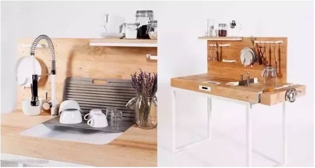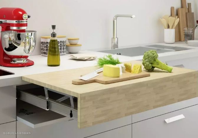 6、可扩展桌子:可以增加厨房的可用空间,同时便于轮椅上的人使用。不使用时可以完全隐藏在抽屉中,有的可以调整到台面的高度并与之连接,有的可以展开变成餐桌。