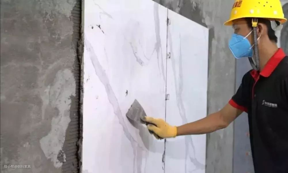 铺贴岩板时应使用专业的瓷砖胶,建议选用柔性瓷砖胶或C2ES级别及以上的瓷砖胶产品,禁止使用云石胶作为粘结剂铺贴岩板。