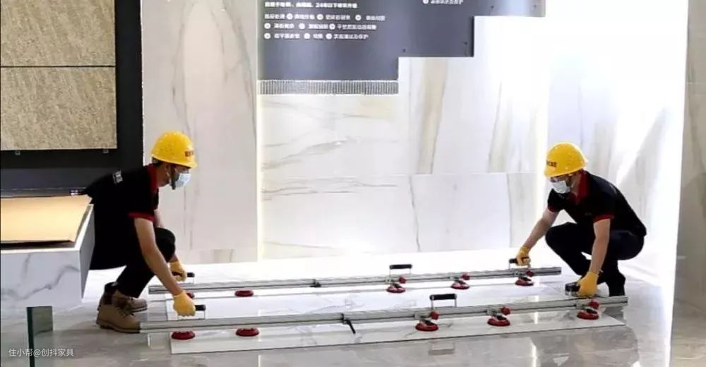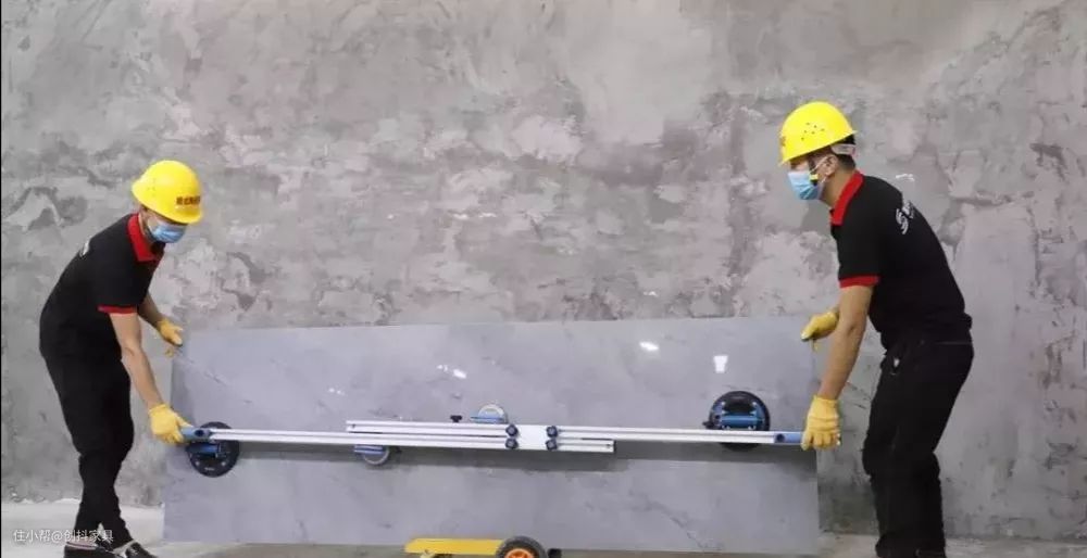 在进行岩板搬运时,应采用符合要求的手泵吸盘或专业抬板杠进行搬抬,放至搬运车上运输,搬运放置过程中严禁单角着地。