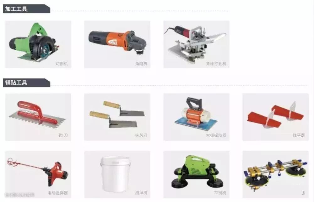 岩板铺贴专业工具:瓷砖专用吸盘、移动固定架、瓷砖防护移动支架、水平尺、激光水平仪、贴墙贴地仪、齿形鏝刀、 钢抹浆刀、瓷砖找平器、推紧钳、平板振动器 (带胶垫)、填缝刮刀、电动切割机、卷尺、 清洁海绵、 电动搅拌器、搅拌桶、刮平板、缝隙伸缩器、开孔定位器、 手动切割器、钻孔机。