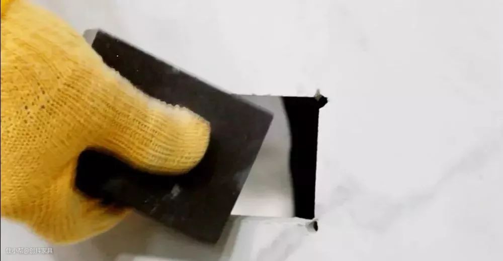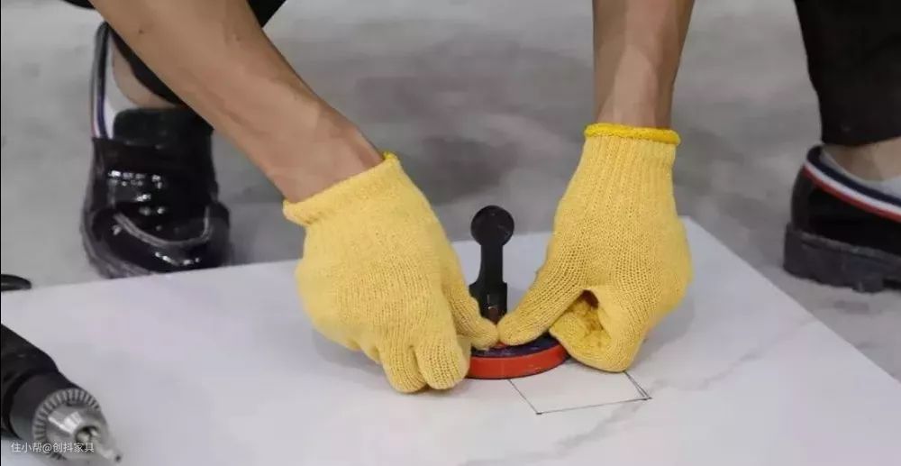 岩板铺贴过程中会需要切割倒角、开圆孔、开方孔等加工工序。测好尺寸,使用切割机、玻璃钻孔器等工具切割、开孔。