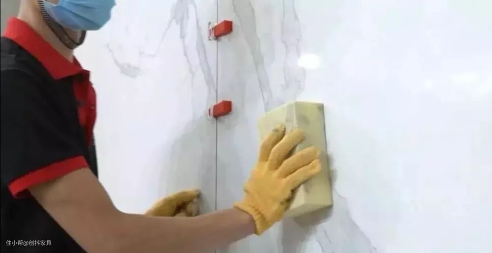 04 粘贴面清理/ 粘贴面不应有灰尘及异物,避免粘贴效果影响,宜采用海绵清理粘贴面,并注意检查板材是否有裂纹。