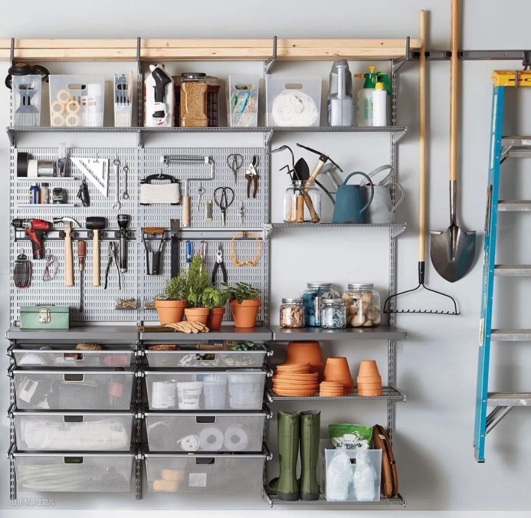 依旧是熟悉的墙面挂条、可调节搁板、集网篮、挂杆一体的万能储物家具,想怎么组合怎么装,实用程度惊人,比艾格特配件更简单。