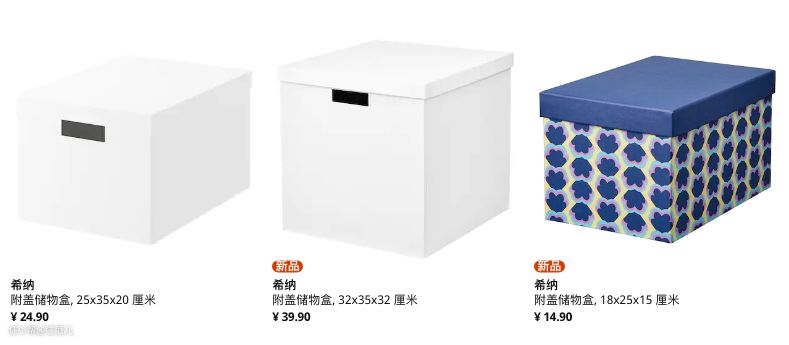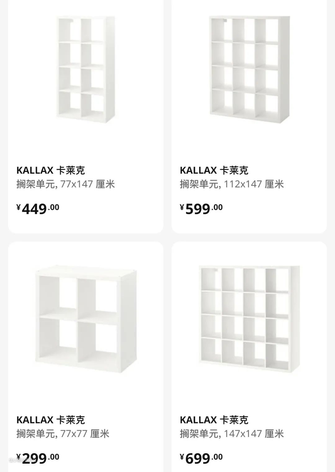不同尺寸希纳储物盒都能在宜家找到对应合适的收纳单元格,比如毕利书架,卡莱克搁架单元等。